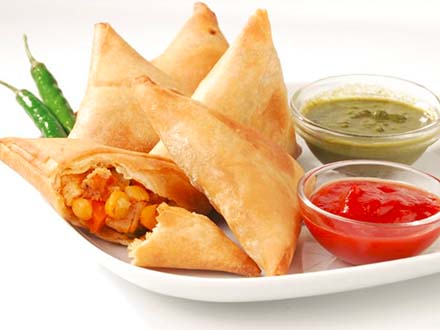 Flaky pastry dough filled with spiced potato and peas, served with chutneys