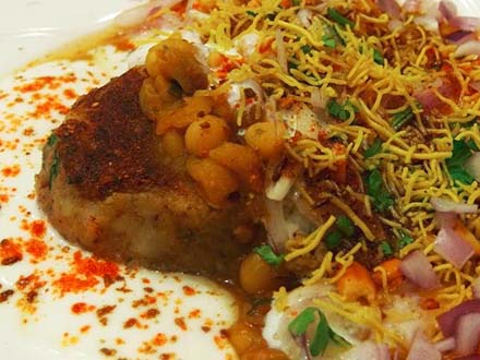 Vegetable samosa topped with spices, onion, yogurt, sauces served with chickpea curry